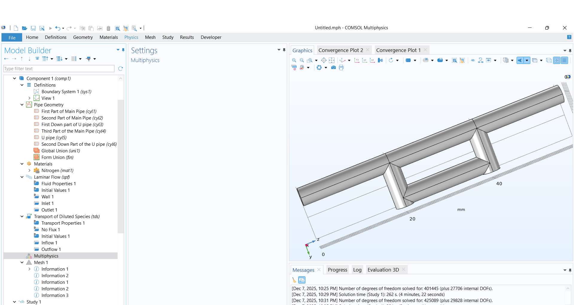 I have a COMSOL Multiphysics geometry as shown in the figure below. The model consists of a main pipe with an inlet at the upstream end and an outlet at the downstream end.