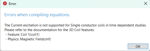 I am working with a planar-type coil modeled as a solid conductor in COMSOL. The coil is excited using a sinusoidal voltage source through an external I–U coupling. The Coil Geometry Analysis study runs successfully. However, when I attempt to run a Time Dependent study, COMSOL returns the error: **"Current excitation is not supported in single conductor coils in time dependent studies."** To troubleshoot, I also tried removing the external circuit and directly applying a current excitation in the coil, but the same issue persists. I have attached the corresponding .mph file for reference. Could you please help me understand how to correctly set up the coil excitation for a time dependent study in this case? Thank you for your time and assistance. Best regards, Anushka Mahajan
