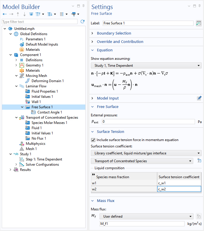 在模拟微流体装置与工艺时,自由表面 和流体–流体界面 特征现已支持经典的浓度梯度驱动马兰戈尼效应。此功能可用于模拟表面张力驱动的流动现象,例如,“酒泪”效应。