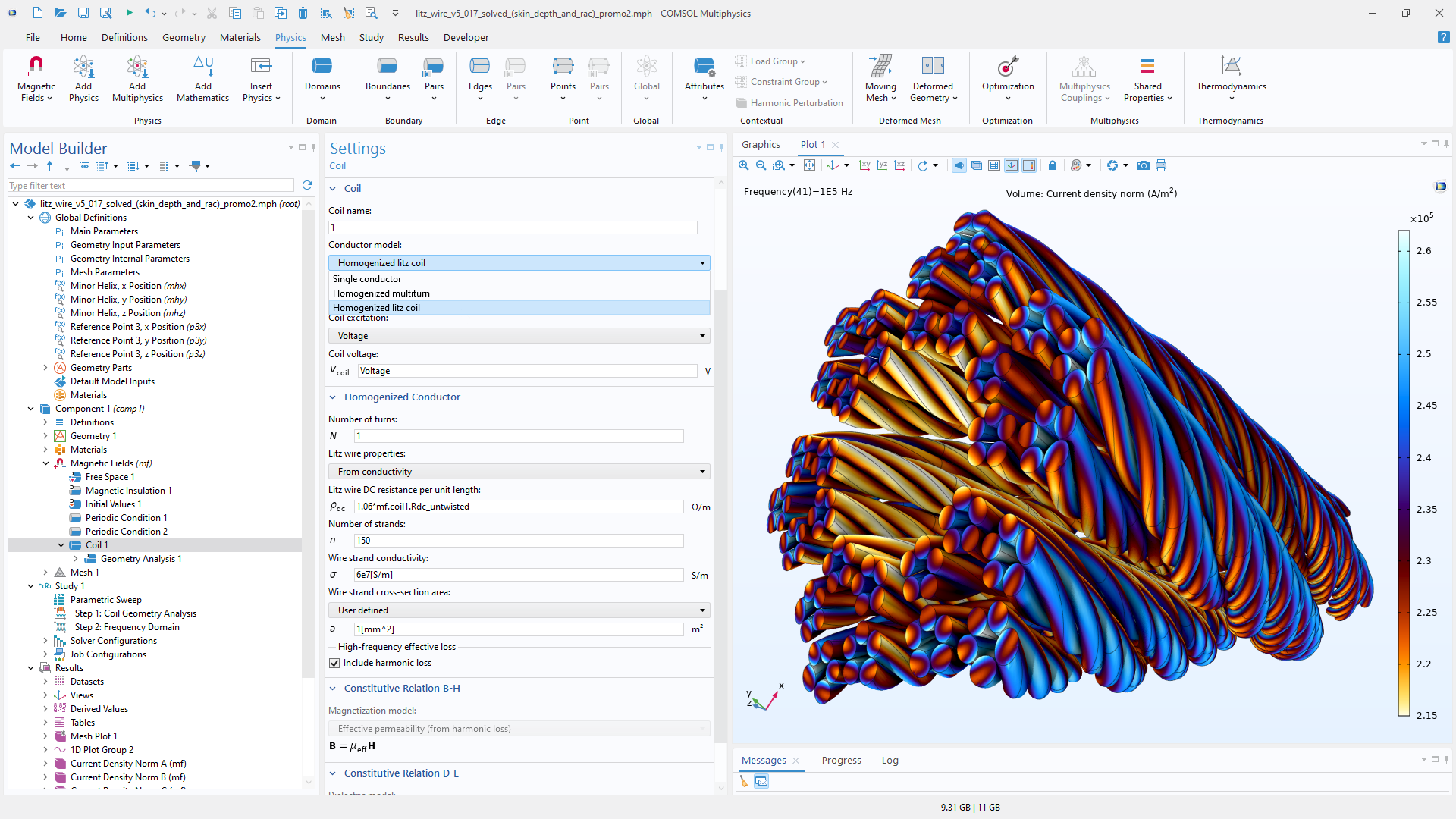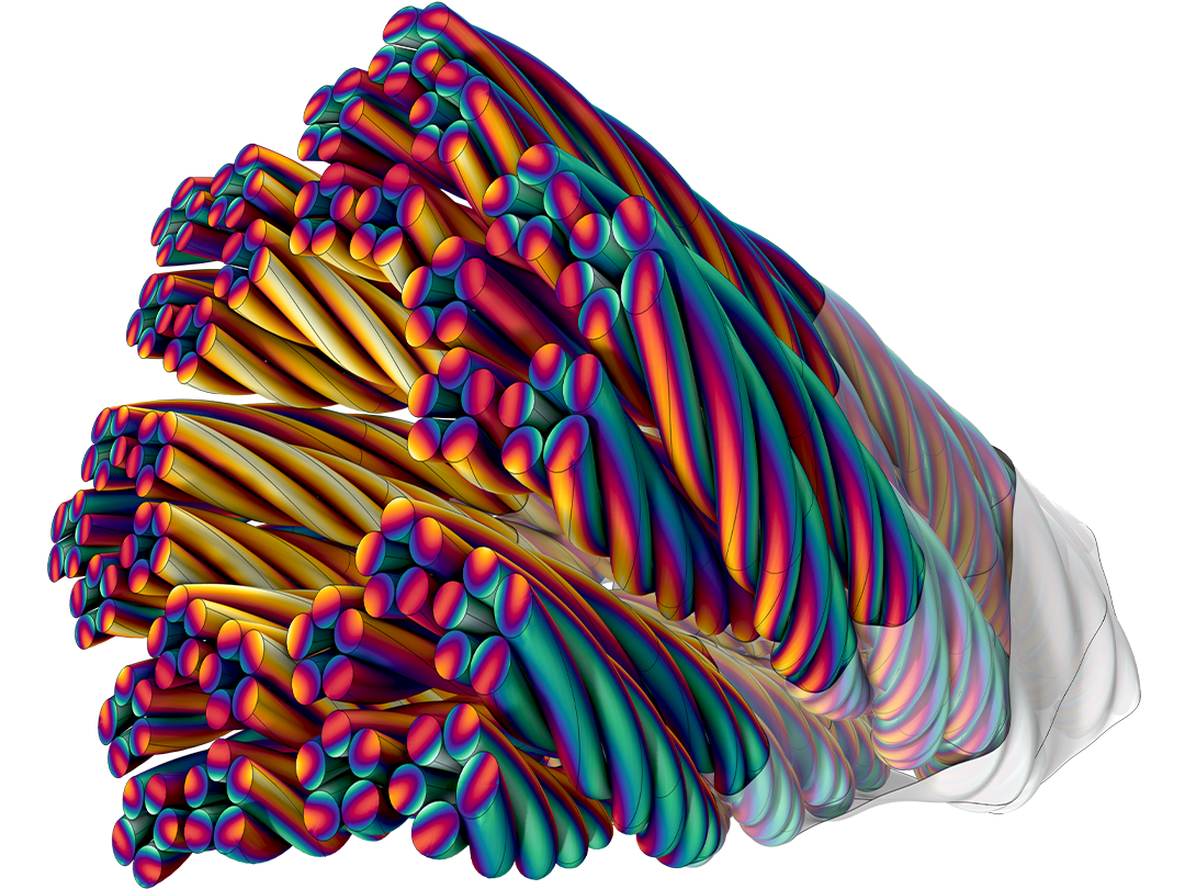 The coil modeling tools handle everything from solid conductors with skin and proximity effects to stranded wire bundles designed to minimize AC losses. They also support designs such as litz wires, tightly wound coils, and segmented high-voltage conductors.