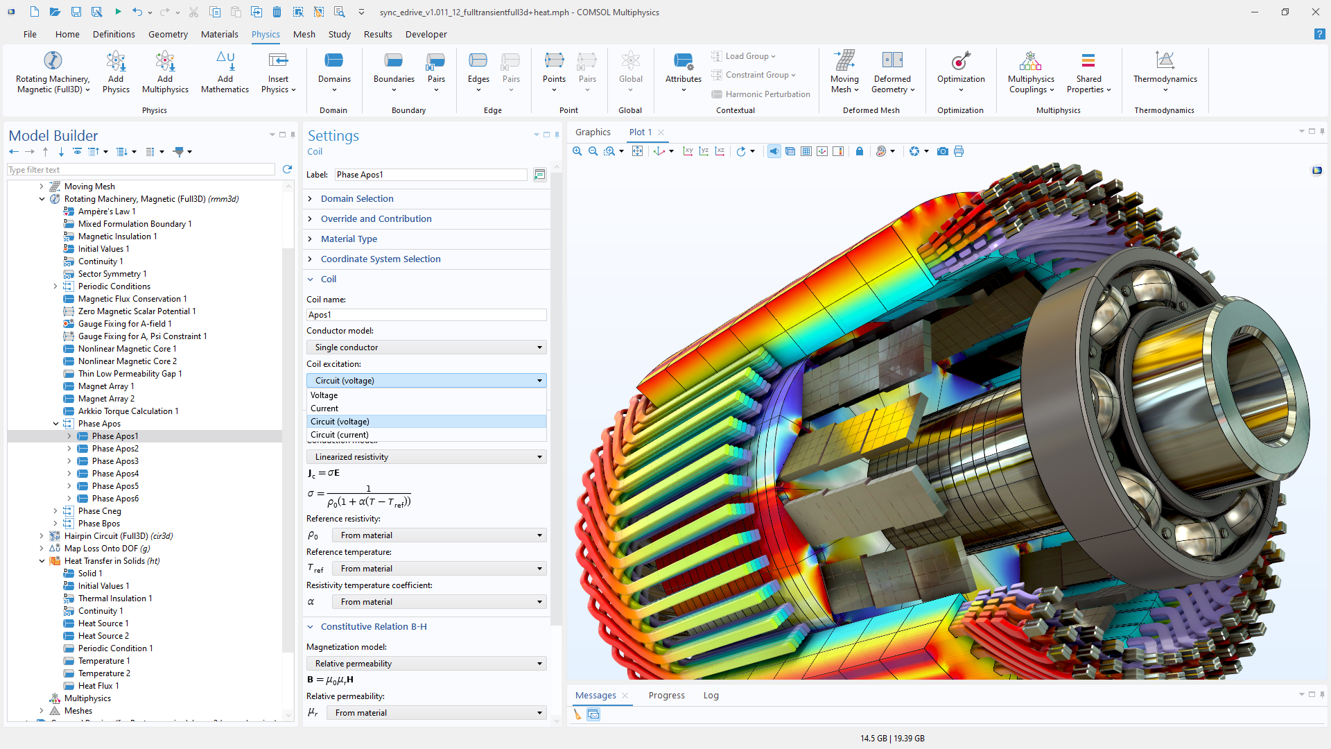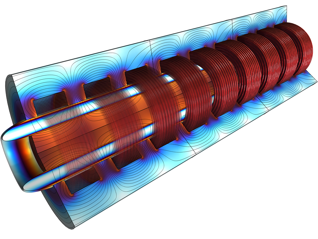 Specialized features support the design of various machine types, from radial flux motors to hybrid axial–radial flux rotors, claw-pole rotors, and tubular linear machines. Linear motion can also be modeled using moving mesh functionality, which is important for devices such as plungers, solenoids, switches, and actuators.