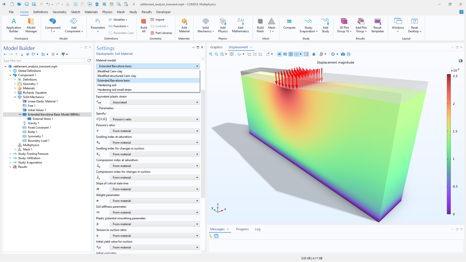 岩土力学材料的仿真功能全面提升了“结构力学模块”的结构分析能力。为了在岩土工程分析中精准模拟真实世界的效应和复杂行为,用户可以将“岩土力学模块”与 COMSOL 产品库中的其他模块无缝结合,实现多物理场效应的耦合分析。例如,结合地下水流模块,能够高效模拟多孔介质流动、多孔弹性、溶质运移和传热等多物理场耦合现象。
